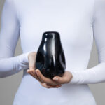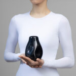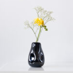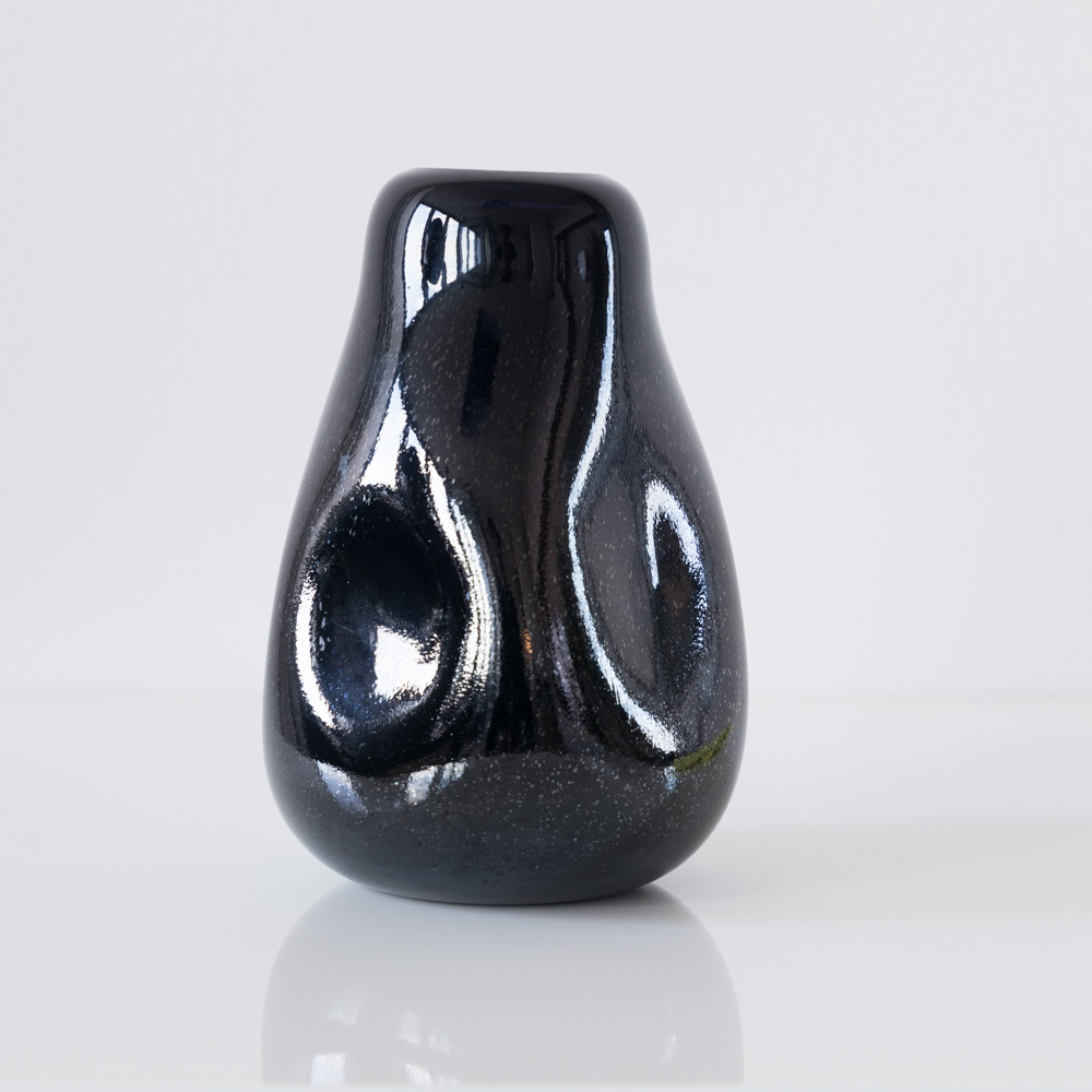 Ručno puhana staklena vaza s jedinstvenim, organskim udubljenjima sa strane, koji ju čine jedinstvenom.