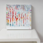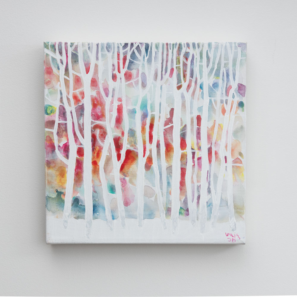 U slici Jesen, Ji Suk Baek prikazuje šumu u prijelazu godišnjeg doba. Bijele siluete drveća ističu se na bogatoj, apstraktnoj pozadini crvenih, zelenih, zlatnih i ljubičastih tonova. Spajajući korejsku jednostavnost i zapadnu izražajnost, autorica poziva na razmišljanje o tihoj ljepoti promjene i prolaznosti u prirodi